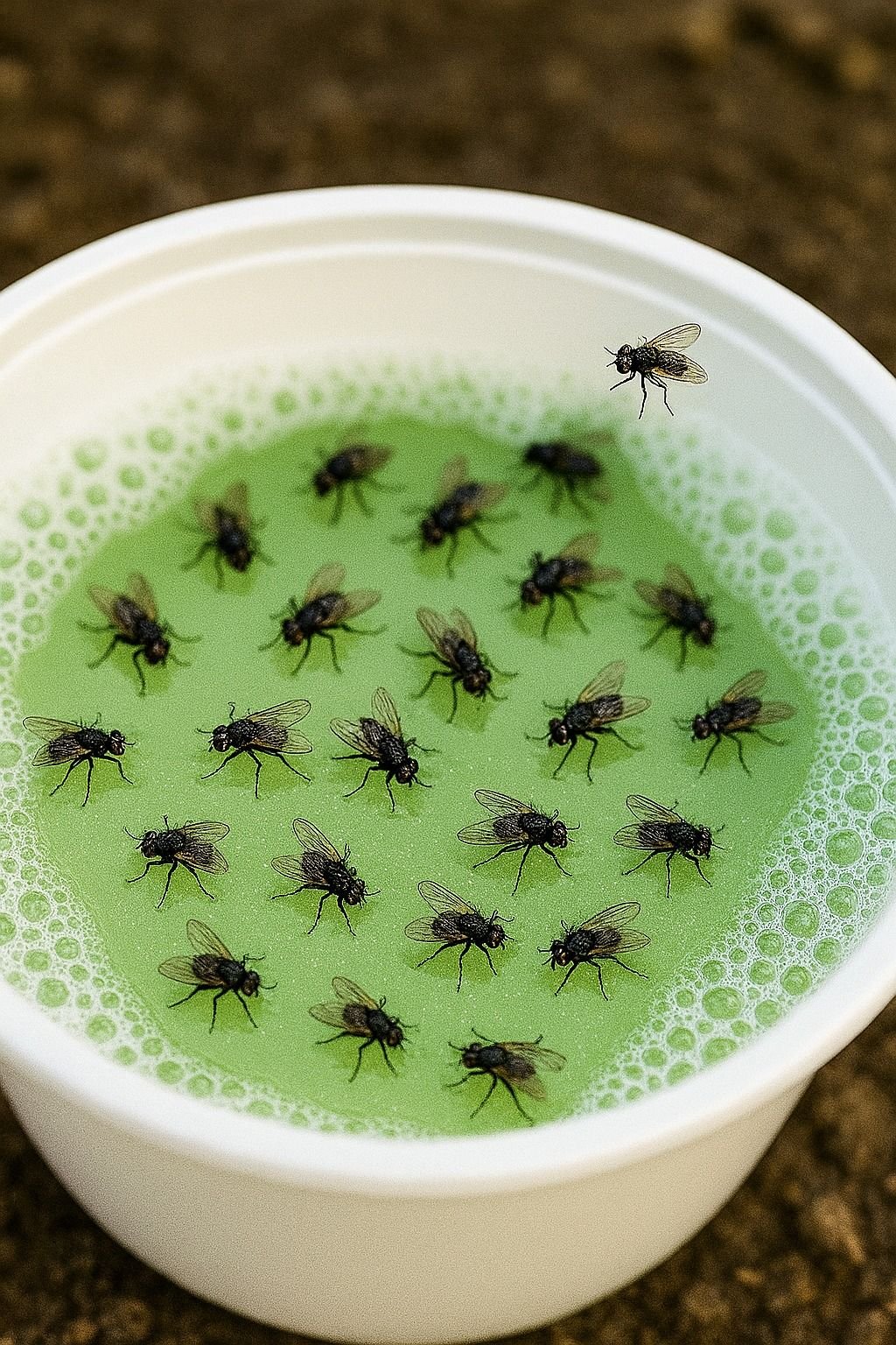 Le mélange vinaigre-sucre attire les mouches par l’odeur. Elles se posent sur la surface, mais le liquide vaisselle casse la tension de l’eau, les empêchant de repartir.